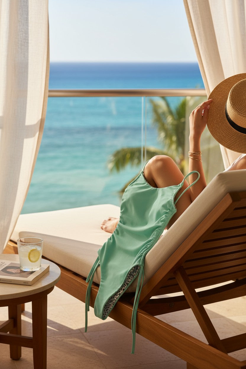 - Descripción: Traje de baño de una pieza reversible con verde y animal print con cuerdas para ajustar a cada cuerpo. |